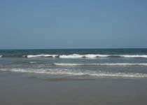 这里白色的沙滩随海湾宛然伸展,沙滩旁绿树婆娑,海水蔚蓝清彻。清风徐来,海天一色,确是游